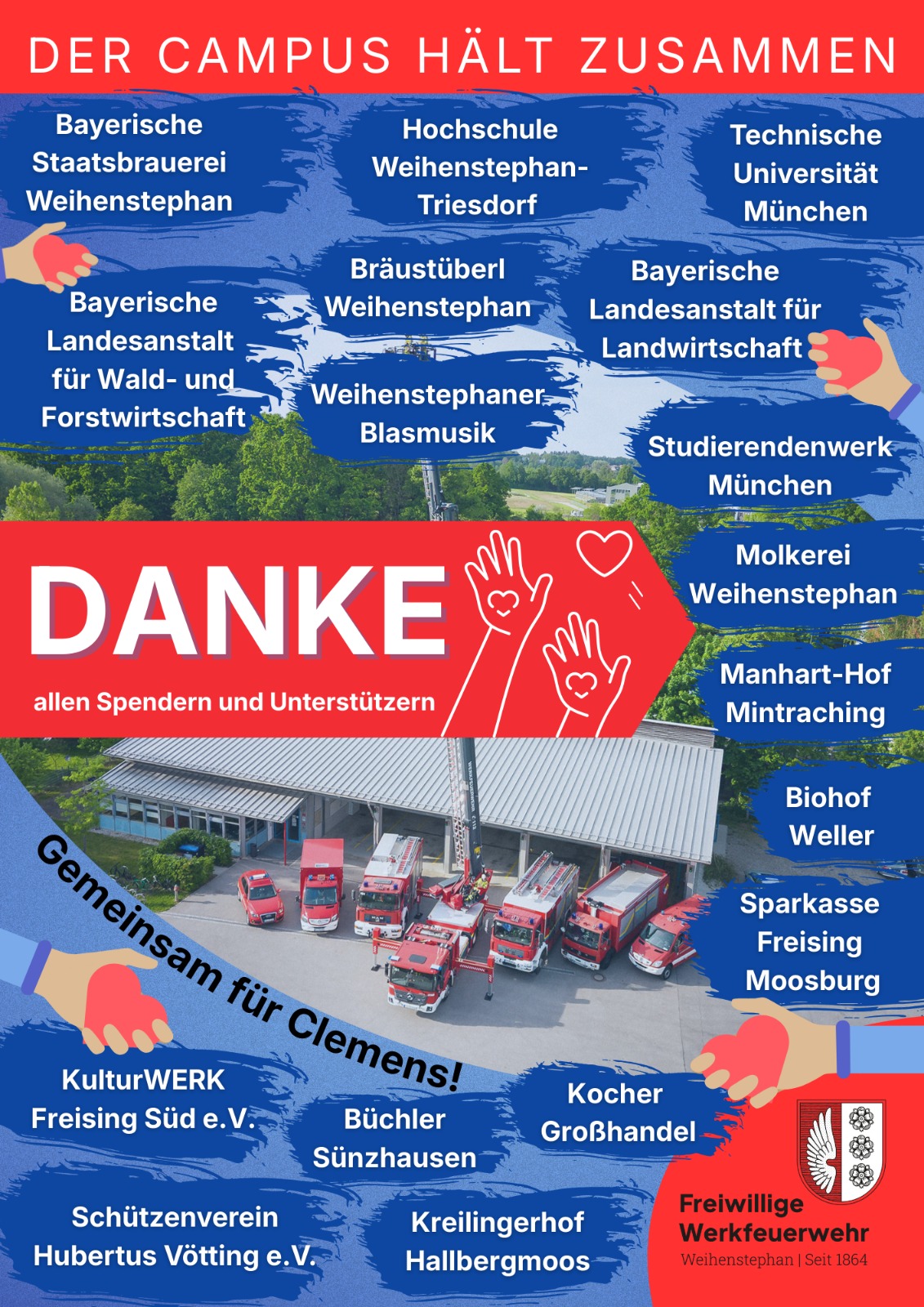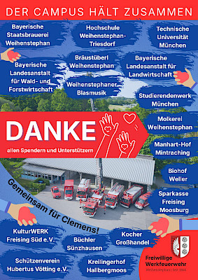Um Clemens und seine Familie in dieser neuen Lebenssituation zu unterstützen, hat die Werkfeuerwehr Weihenstephan eine Spendenaktion organisiert. Dank der beeindruckenden Hilfsbereitschaft und dem enormen Zusammenhalt am gesamten Forschungscampus Weihenstephan konnten insgesamt 10.000 € gesammelt werden.